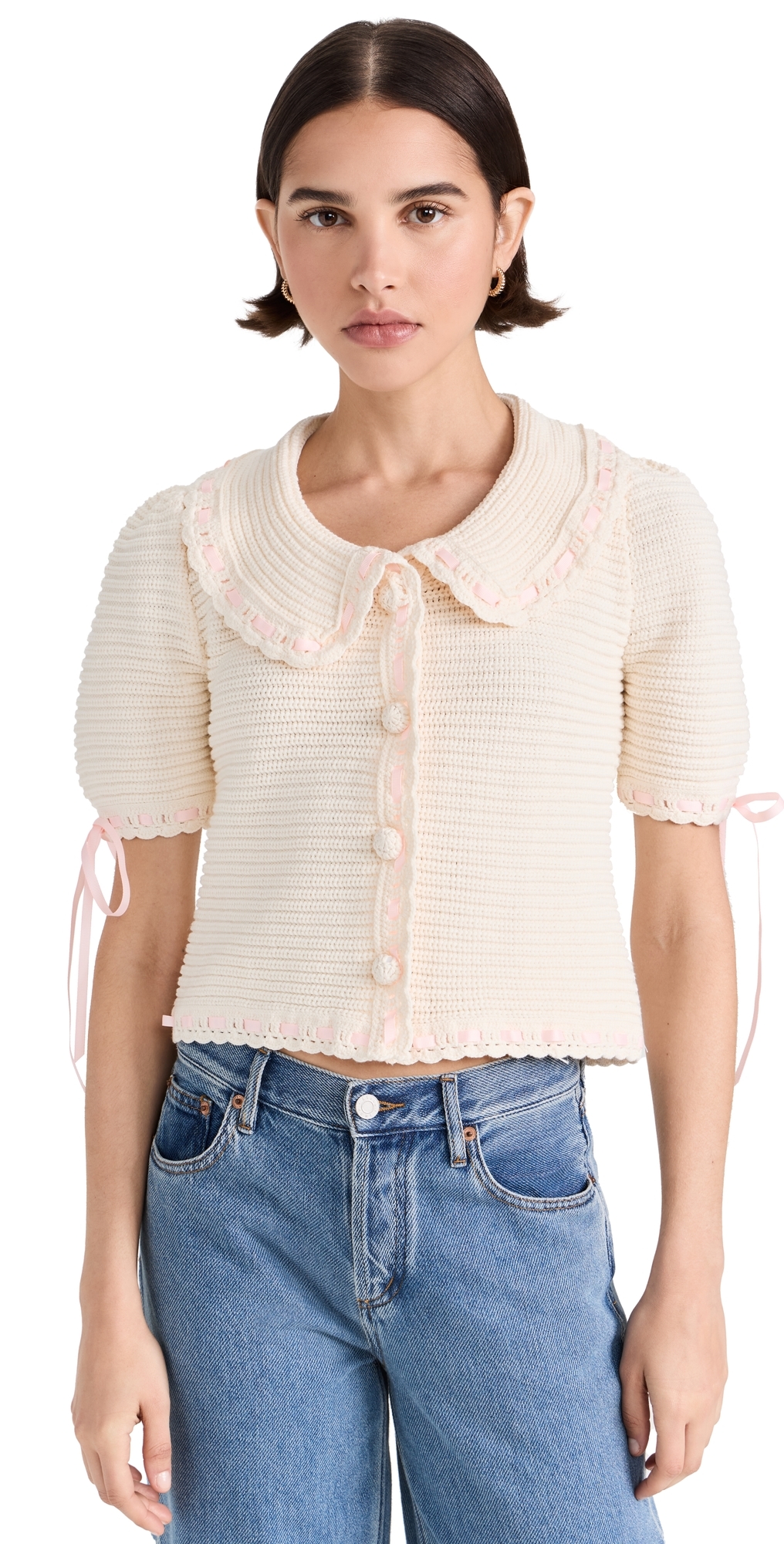 Fabric: Mid-weight ribbed knit. Grosgrain ribbon trim. Collared neck and button placket. Short puff sleeves. Shell: 60% cotton/40% nylon. Trim: 100% polyester. Dry clean. Imported, China. Measurements: Measurements from size S Length: 17.75in / 45.0cm, from shoulder
