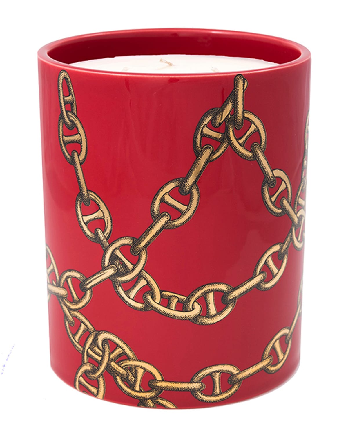 Adorned with striking gold chains, Catene symbolizes our desire to stay linked and connected to the people and the things we love most in life. This statement design reminds us that not everything has to have a beginning or an end and that the love we feel for family, friends and our homes is eternal. Filled with signature Otto, this wonderfully warm, smoky scent combines wild and aromatic Mediterranean herbs, sun warmed Orris, Cedarwood and Birch, laced together with swirls of perfumed incense. Top Notes: thyme, lavender. Middle Notes: orris, cedarwood. Base Notes: tolu balsam, incense, birch, labdanum. Earthenware vessel. Vegetal wax blend. Burn time, 120 hours. 31.75 oz./ 900 g.