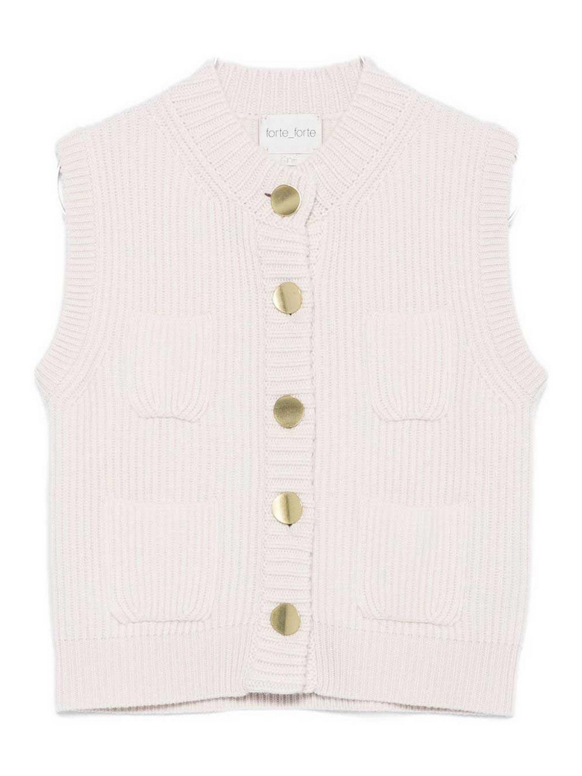 Poches plaquées boutonnées en tricot côtelé blanc cassé sans manches et col rond