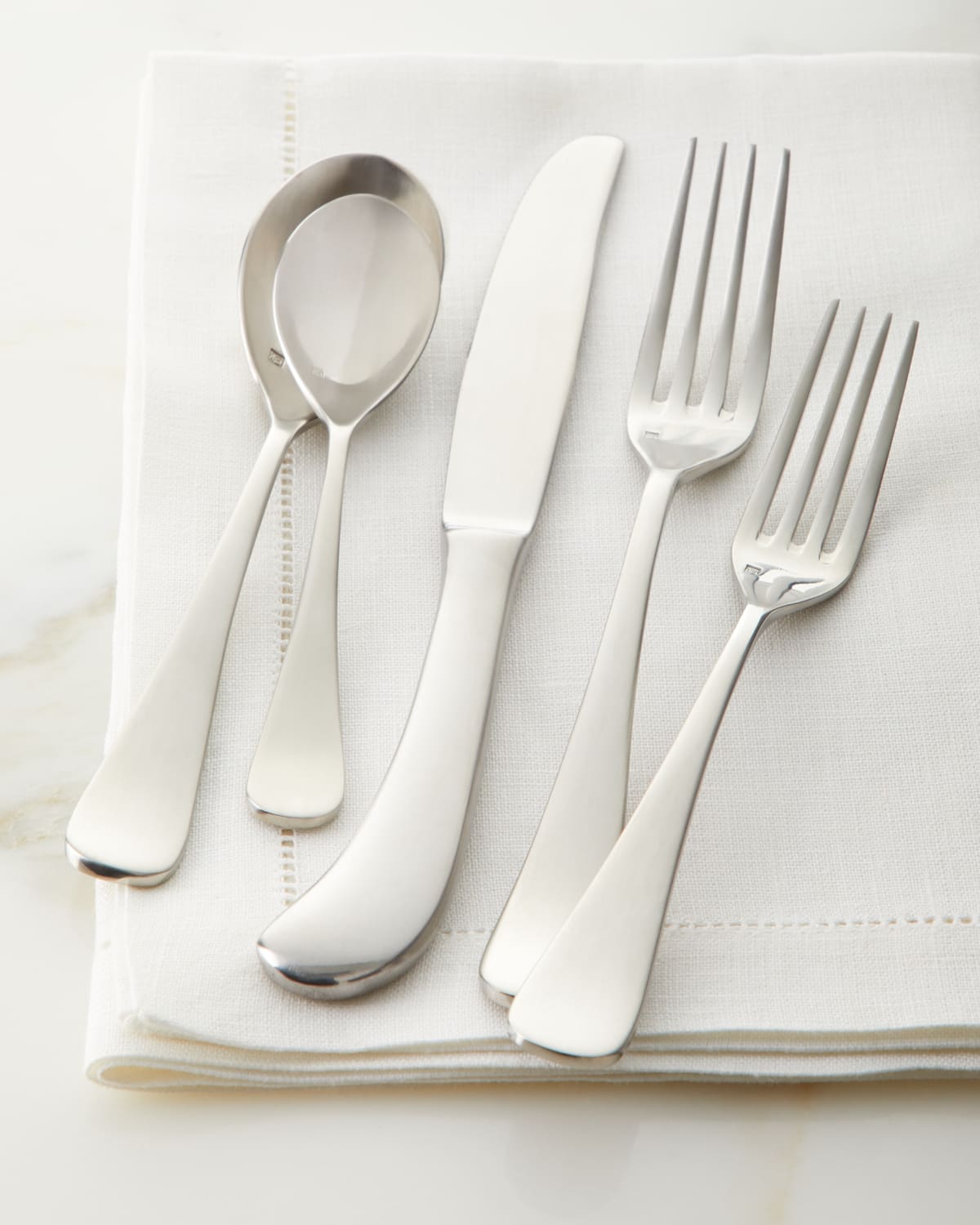 The Mariposa flatware set will become an integral part of any tabletop with a contemporary versatility that will surprise you. Forged of 18/10 stainless steel. Service includes four dinner forks, four salad forks, four dinner knives, four place spoons, and four teaspoons. Dishwasher safe. Imported.
