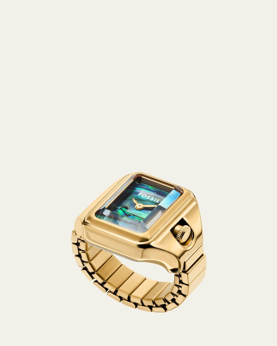 Revisit a true classic with the Raquel watch ring by Fossil. This stretchfit ring features a rectangular watch head. The ring functions like any other Fossil watch. Approx. 0.73"L x 0.6"W Golden ionplated stainless steel Abalone shell dial with two hands Logo text at 12 o'clock Coinedge winding crown Stretchy; adjustable fit Spot clean Imported