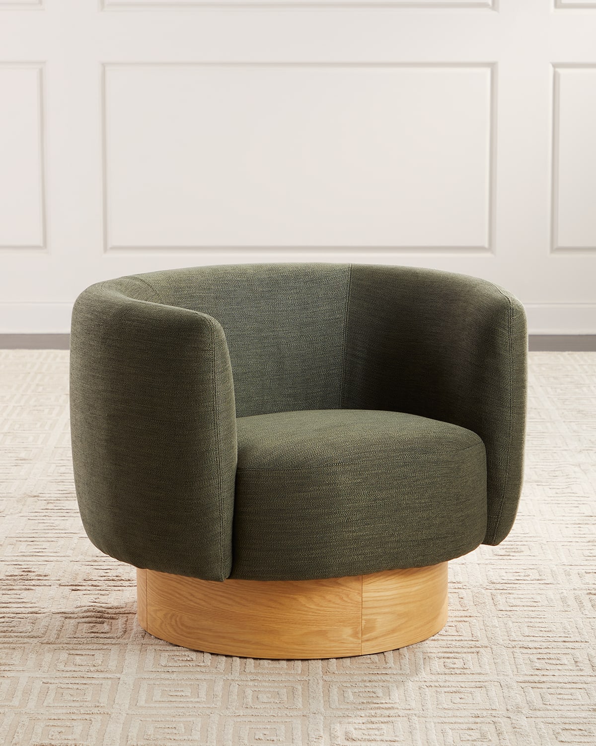 Handcrafted swivel arm chair Upholstery, polyester/viscose Frame, oak veneers Webbed construction Overall, approx. 39.25"W x 32.75"D x 29.25"T Seat, 23.25"D x 17.75"T Arm height, 29.25" Finished back Includes hardware Weight, 77.0 lbs Imported Boxed weight, approximately 95.0 lbs