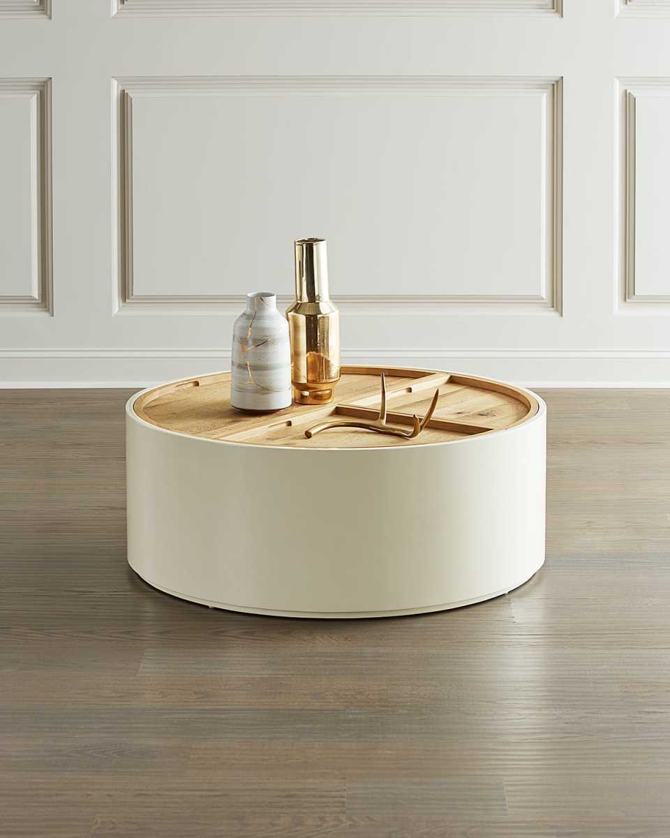 Handcrafted coffee table. Three removable trays connect on top. Oak frame with cream lacquer finish. 42"Dia. x 16"T. Imported. Boxed weight, approximately 128 lbs.