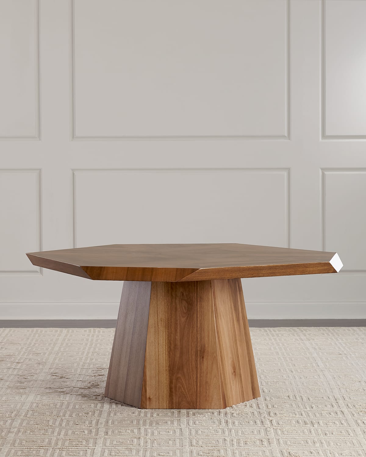 Handcrafted dining table of blonde yukas wood. Light assembly required. Glued, stapled and screwed. 60"Dia. x 30"T. Base: 28"L x 32.5"W x 27.5"H. Imported. Boxed weight, approximately 121.3 lbs.