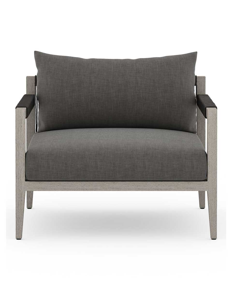 Modern materials ready a stylish silhouette for the outdoors. Weathered grey teak forms a clean frame for UVresistant and waterrepellent Sunproof fabric in a textural navy. Cover or store indoors during inclement weather. Handcrafted of olefin, teak, and polyethylene. Overall: 33"W x 34.3"D x 24.5"T. Seat: 30"W x 32.8"D x 14.8"T. Imported. Boxed weight, approximately 3.5 lbs.