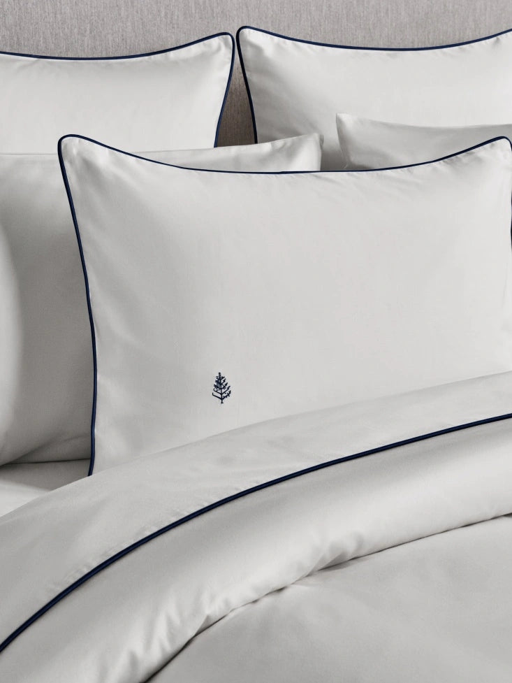 The Sycamore Linen Set represents a modern evolution of our Signature linens. Crafted from a premium 400 thread count Egyptian Oxford percale, with contrast two-tone piping, and subtle embroidered Four Seasons logo and offers a lightweight feel as crisp touch. Available in our best-selling colors, invite our most luxurious linens home. The Sycamore Linen Set includes the following:Sycamore Sheet Set:-1 deep pocketed Fitted Sheet-1 modern hemmed Flat Sheet -2 Pillowcases Sycamore Duvet Cover Set:-Duvet Cover with hidden button closure system -2 Pillow Shams -2 Euro Shams