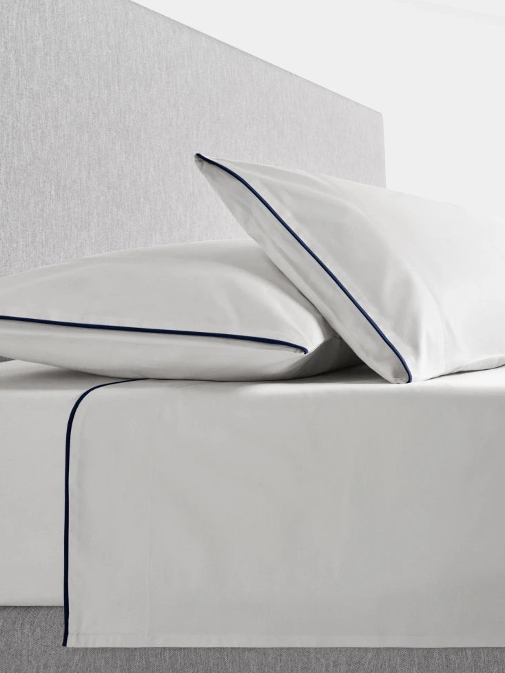 Constructed in a premium 400 thread count Egyptian Oxford percale, the Sycamore Sheet Set is a classic evolution of our Signature hotel linens, featuring a contrast piping trim detail. The premium fabric offers a lightweight feel, while holding a firm body that maintains a crisp, tailored look. Available in our best-selling color combinations; Signature White and Balinese Pearl. The Sycamore Sheet Set includes the following:- 1 deep pocketed Fitted Sheet - 1 modern hemmed Flat Sheet - 2 Pillowcases