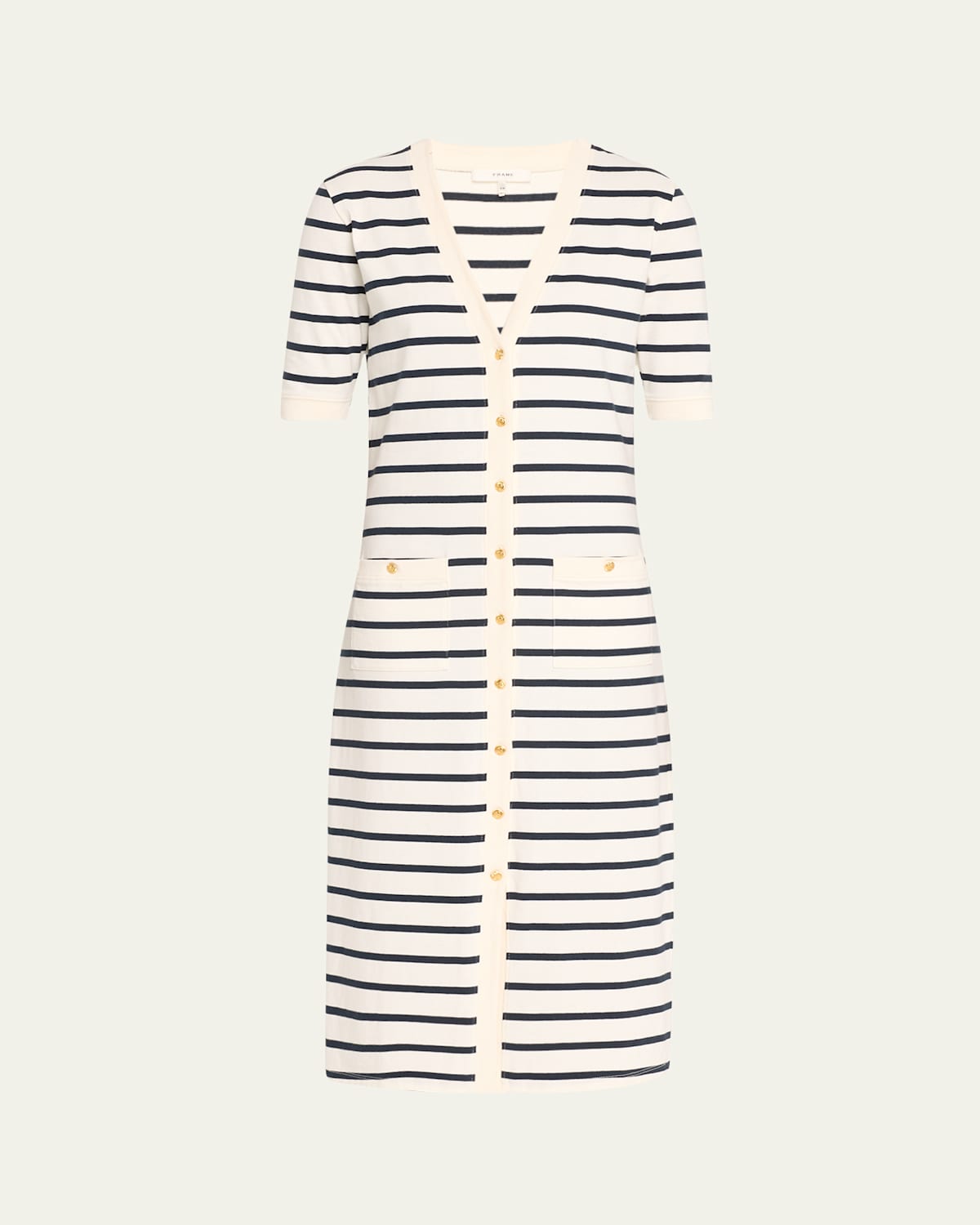 FRAME stripe knit midi dress featuring a buttonfront V neckline Short sleeves Front slip pockets Column silhouette Hem falls below the knee Organic cotton Machine wash cold, wash separately Imported