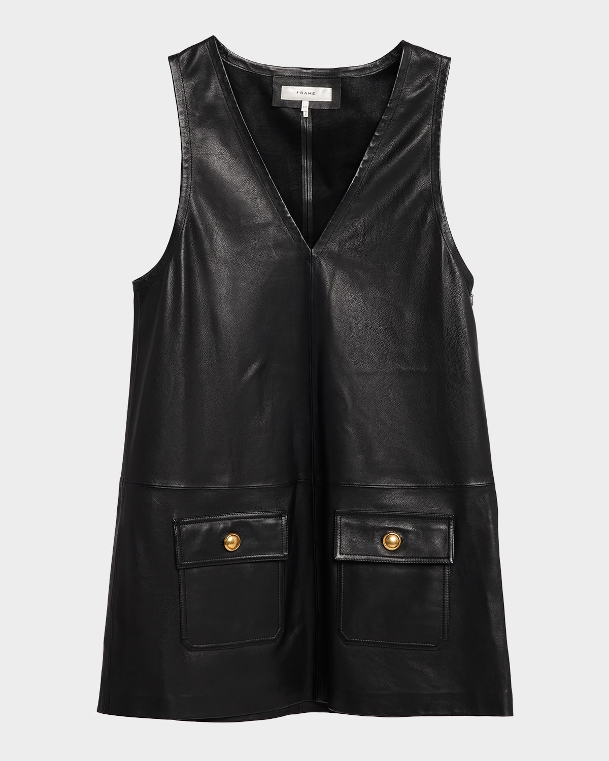 Crafted in smooth leather, this pinafore mini dress by FRAME features a plunging neckline and flap patch pockets with goldtone buttons. V neckline Sleeveless Shift silhouette Hem falls above the knee Zip closure Leather Professional cleaning recommended Imported