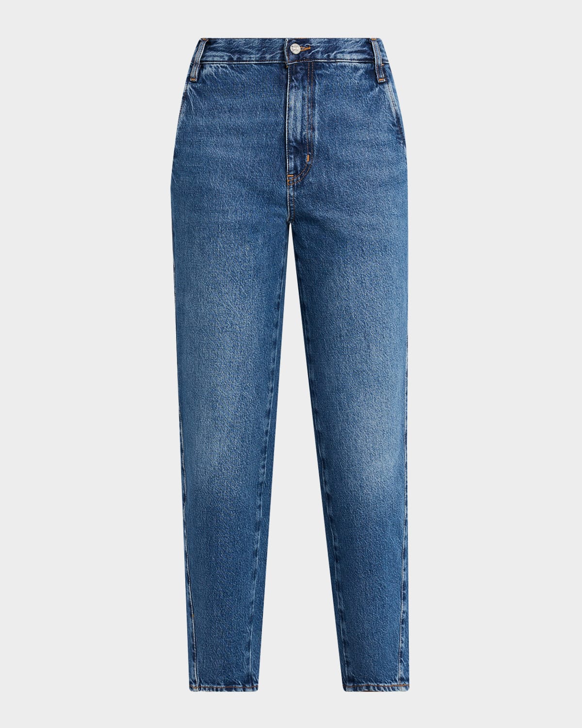 FRAME "The Candle" trouserstyle jeans in mediumwash denim Approx. 11.5" rise; 28" inseam Midrise; sits high on the hip Side slant pockets; back patch pockets Tapered legs Ankle length Button/zip fly; belt loops Cotton Machine wash cold, inside out Imported