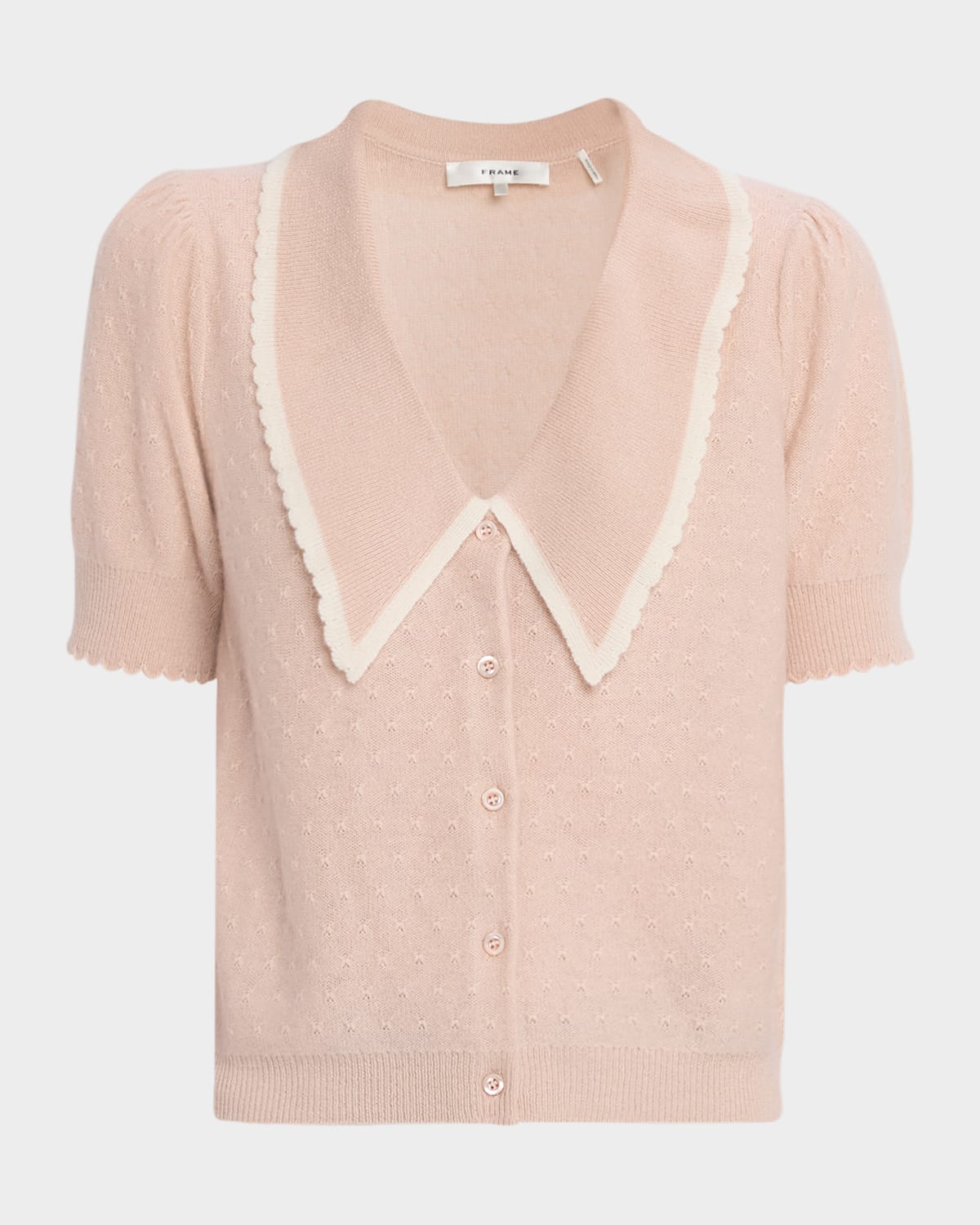 Crafted in cashmere pointelle, the "Sailor" sweater is finished with delicate scalloped trim that exudes femininity with a luxurious hand feel. Sailor collar; V neckline Short puff sleeves Classic fit Hem sits at the hip Buttonfront Cashmere Dry clean only Imported