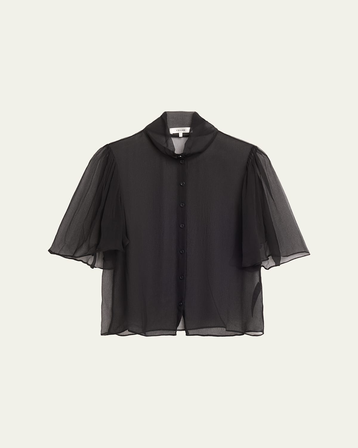 Crafted in luxurious silk, the "Flutter" blouse by FRAME exudes feminine essence with an airy look and feel. Stand collar Elbowlength flutter sleeves Classic fit Hem falls to the hip Buttonfront Silk Lining: Polyester Dry clean only Imported