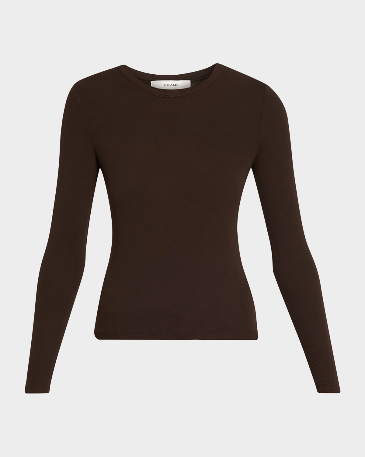 Ribbed top in soft stretch knit by FRAME. Crew neckline Long sleeves Easy fit Hem sits at the hip Pullover style Modal/spandex Machine wash cold Imported