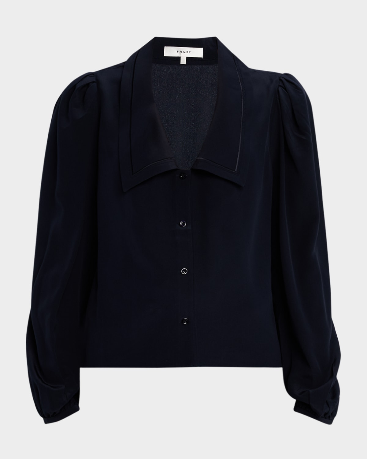 Luxurious silk blouse with a sailorstyle collar by FRAME. V neckline Long puff sleeves with button cuffs Classic fit Hem falls to the hip Buttonfront Silk Dry clean only Imported