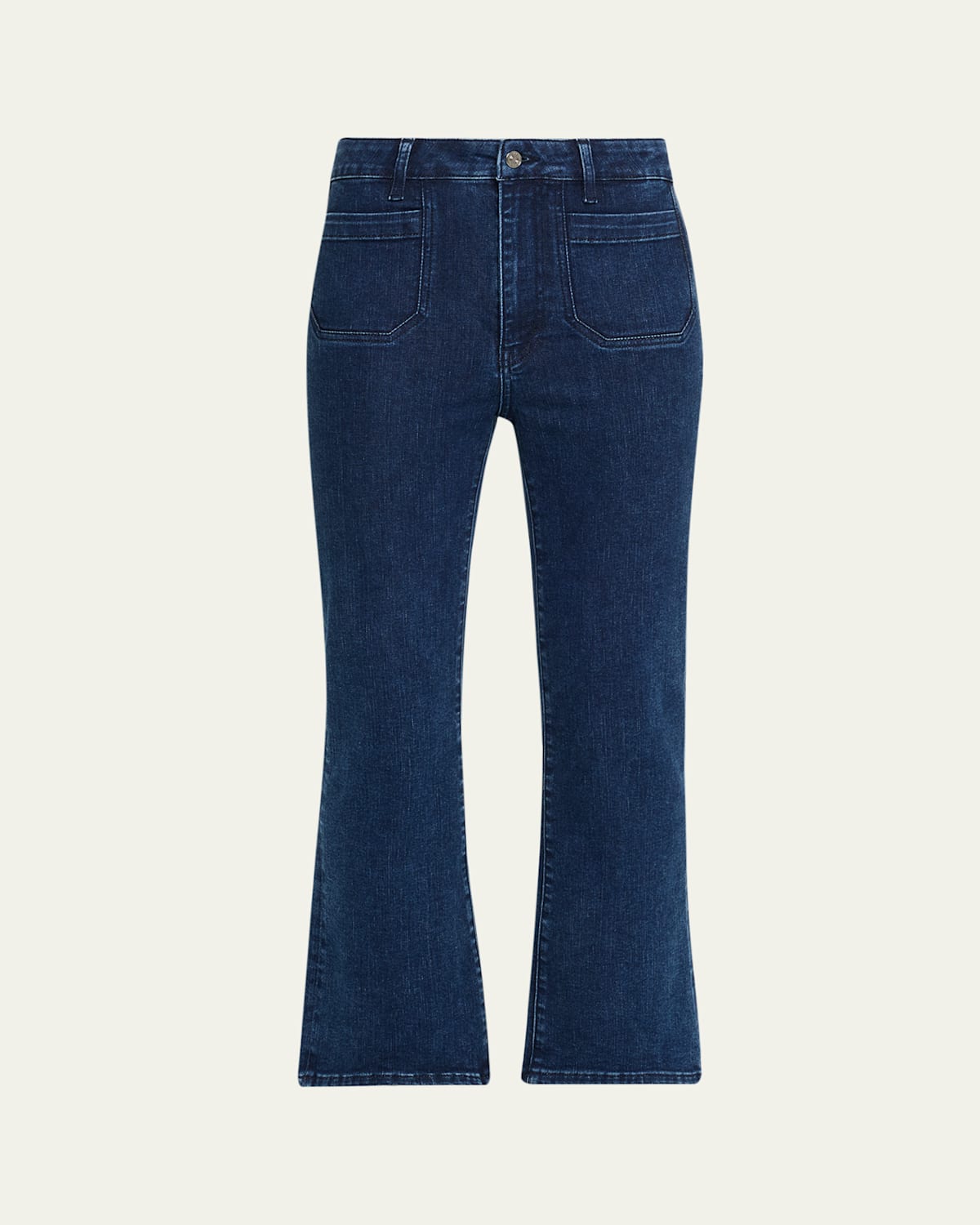 FRAME "The Reboot Crop Modernist Pocket" bootcut jeans in superstretch denim Approx. 11" rise; 27" inseam High rise Front and back patch pockets Fitted through the hip and thigh Cropped length Button/zip fly; belt loops Cotton/lyocell Machine wash cold Imported
