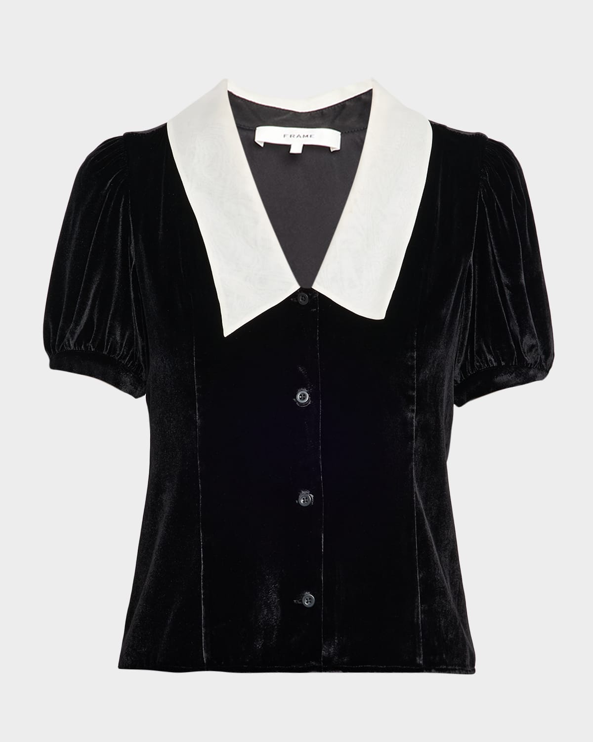 FRAME top cut from velvet and anchored by a contrast collar Approx. 22"L from shoulder to hem Sailor collar Short puff sleeves Hip length Slim fit Button front placket Rayon/cellulose acetate/silk/spandex Dry clean Imported