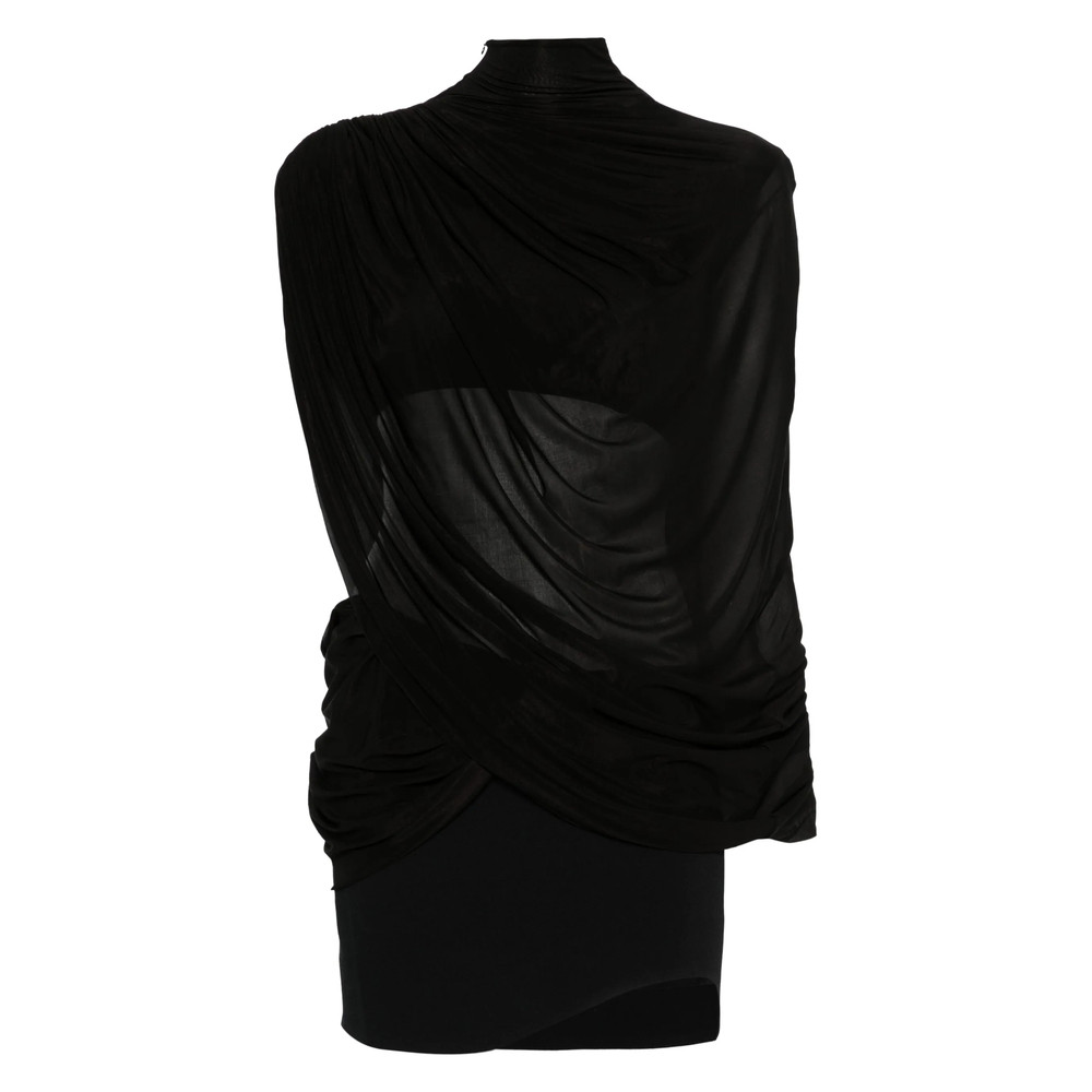 black high neck draped detailing gathered sleeves asymmetrical hem fitted bodice