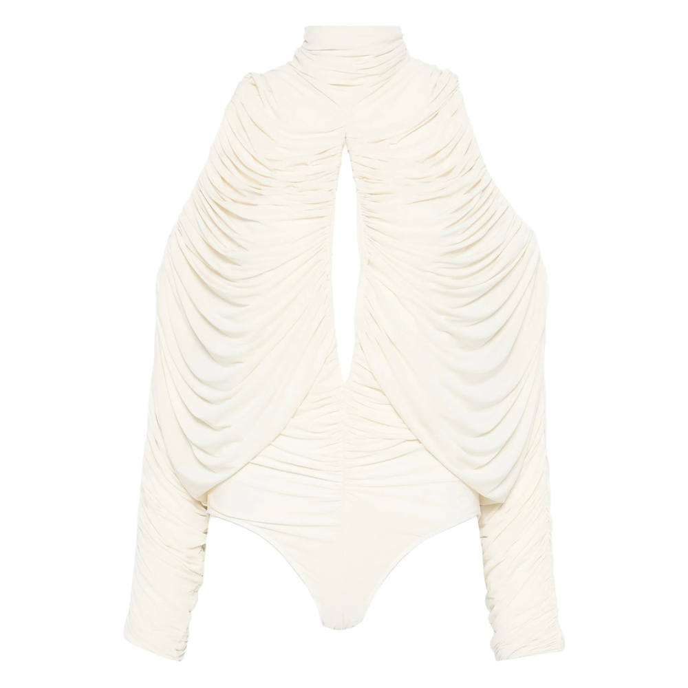 off-white ruched detailing keyhole detail high neck long sleeves zip fastening Just a reminder that this piece must be tried on over your own garments.