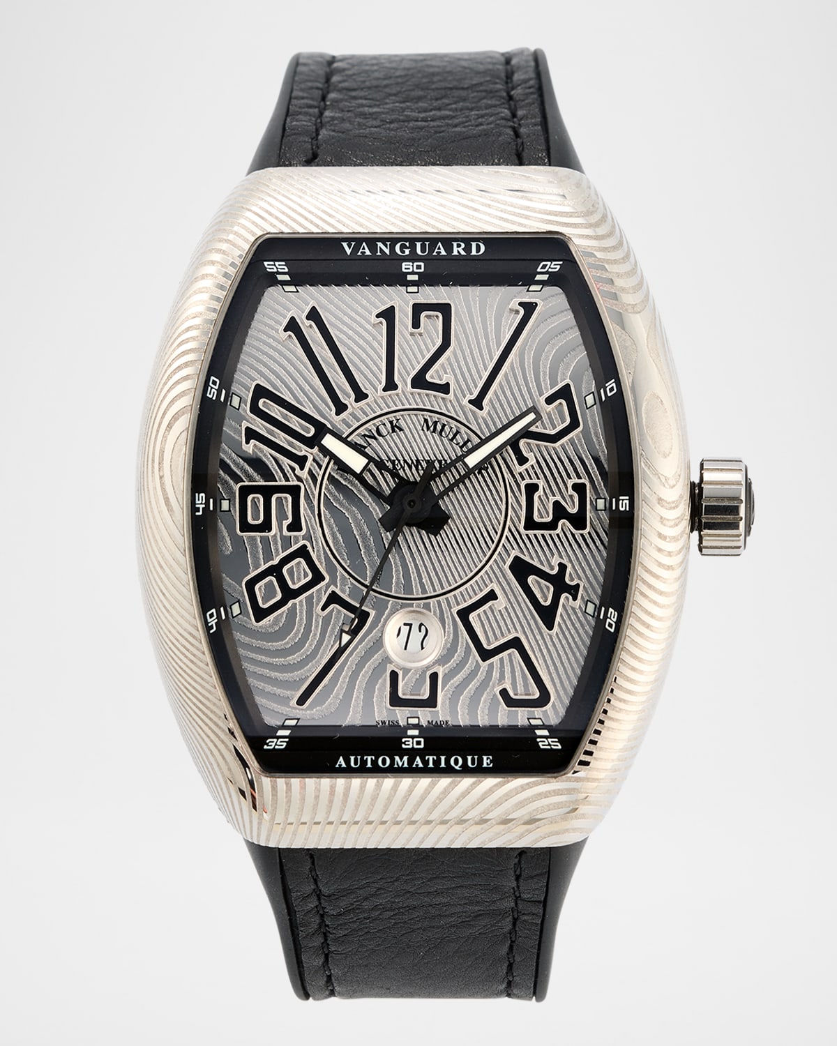 Franck Muller watch from the Vanguard Collection Approx. 45mm tonneaushaped case Handpolished stainless steel Handsewn black leather strap with Damascus steel buckle White dial with black Arabic numerals Sunray brushing on the bridges, rotor segment, bearing cage, and barrel cover Chamfering on the rotor board Inner bezel with 60minute indicator Threehand automatic movement Made in Switzerland