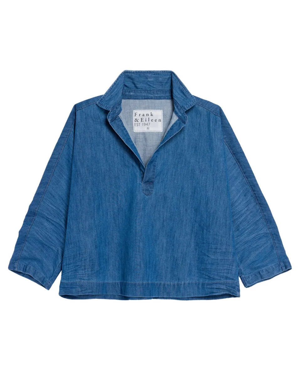 The Gabi Popover in Vintage Distressed Wash by Frank and Eileen is a long sleeve popover featuring three-quarter length sleeves, a collared v-neckline, and slightly cropped silhouette. GABI-VWD