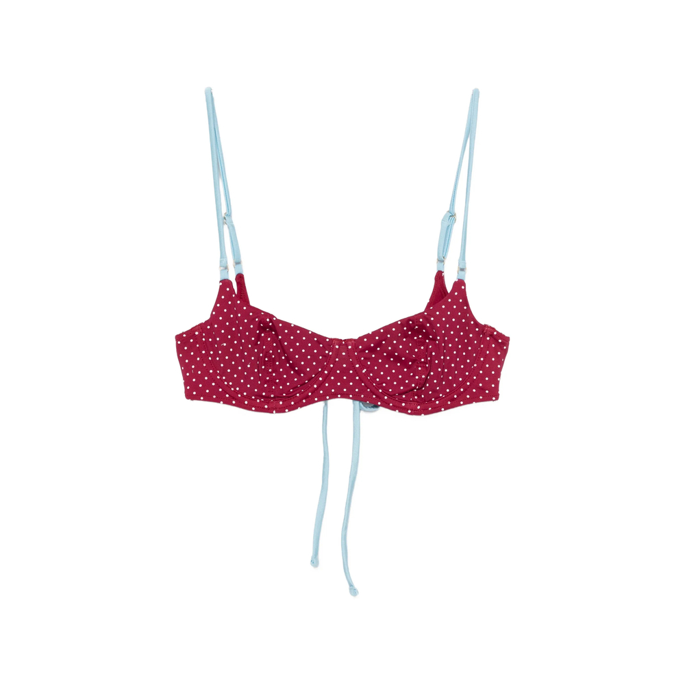 burgundy red polka-dot print underwired cups adjustable shoulder straps rear tie fastening silver-tone hardware Be mindful to try on swimwear over your own garments.