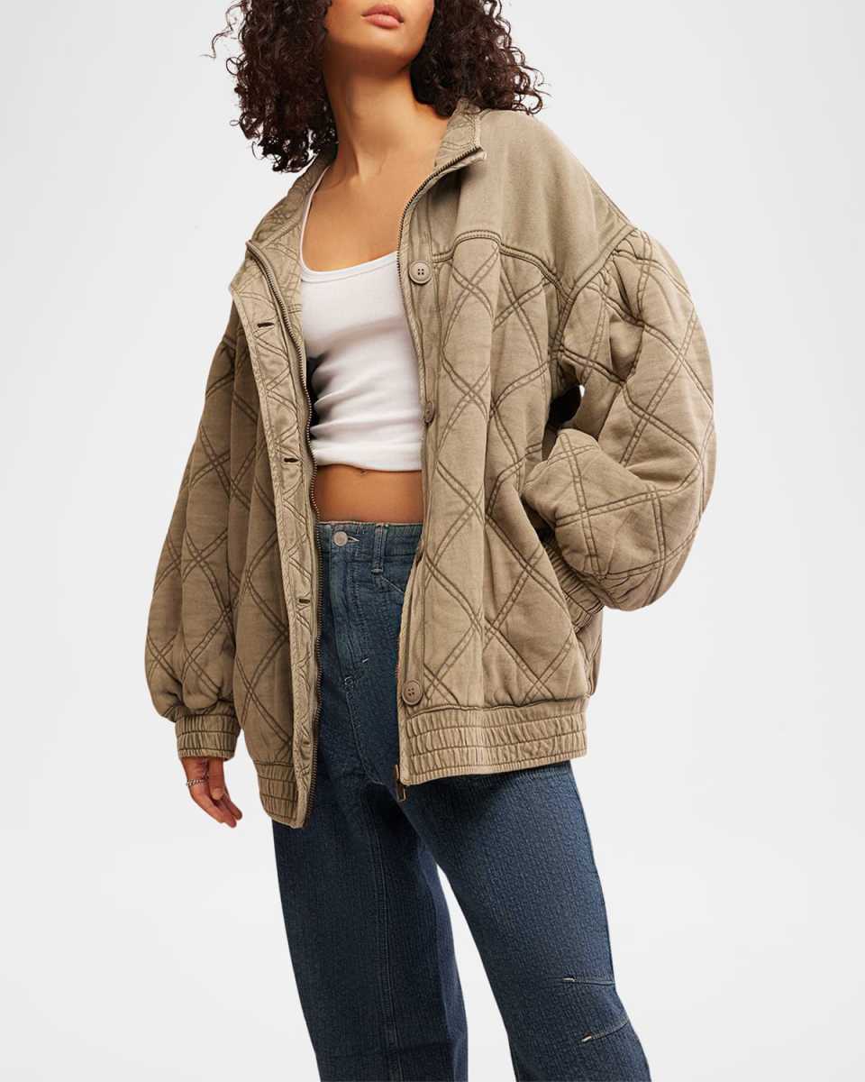Free People "Juno" comfy cotton bomber jacket with quilting throughout and shirred trim Approx. 30"L from shoulder to hem Stand collar; zipper closure with button placket Dropped shoulders Long puff sleeves Midlength Oversized fit Banded cuffs and hem Cotton Lining: Cotton Fill: Polyester Imported