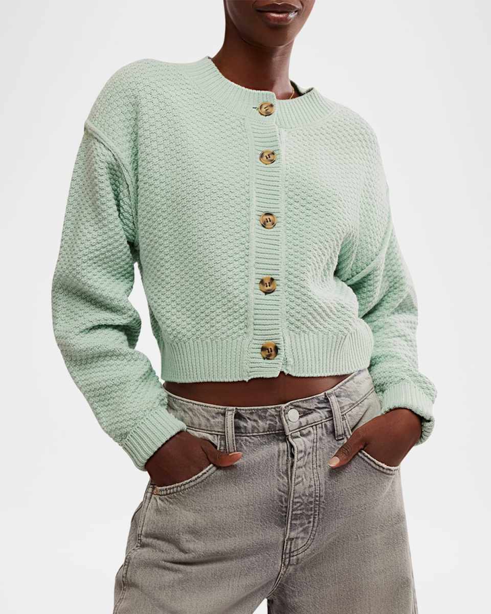 Free People "Lila" classic cardigan in a textured knit fabrication with defined seaming Approx. 19"L from shoulder to hem Round neckline; button front Dropped shoulders Long sleeves Hip length Slouchy, relaxed fit Ribbed cuffs and hem Acrylic/cotton Imported