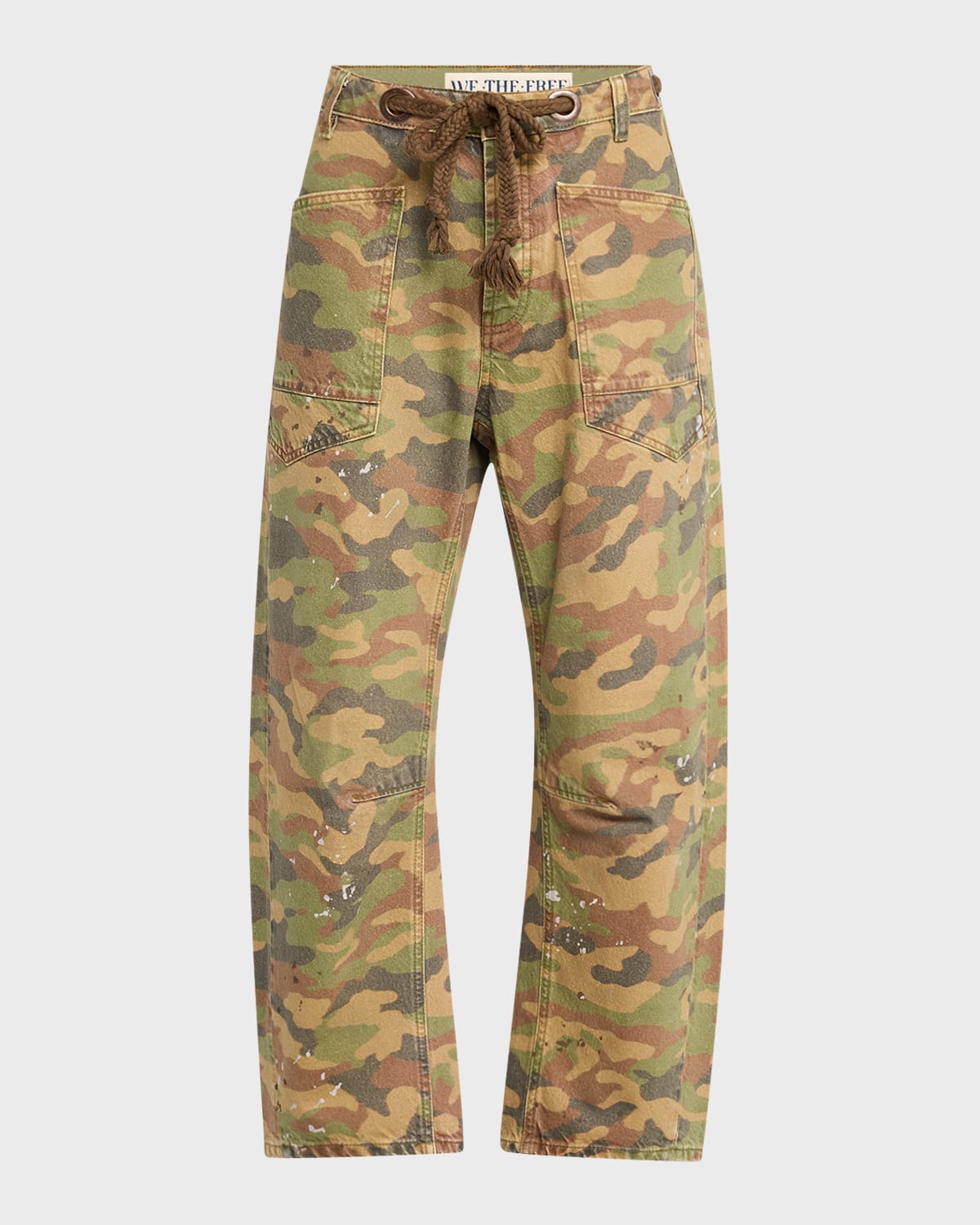 Free People "Moxie" lowslung jeans in a paintsplattered camo print From the We The Free Collection Approx. 26" inseam Midrise drawstring waistband with button closure Oversized patch pockets Full length Tapered legs Belt loops Cotton Machine wash cold Imported