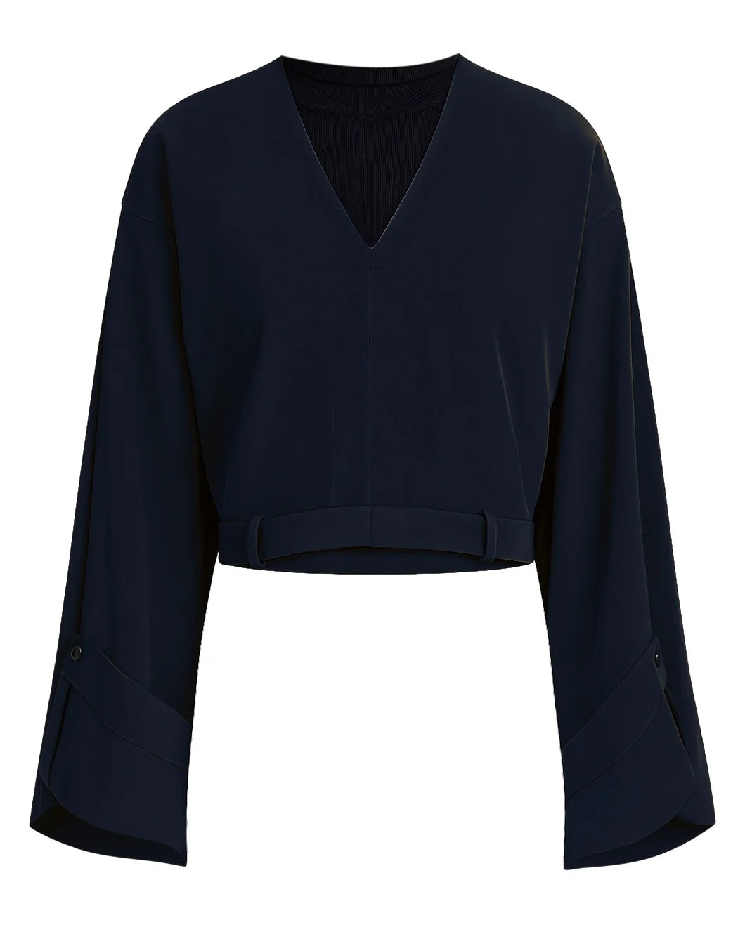 The Pantalon Top in Navy by Frenken is a striking, tailored top featuring a playful twist, making the top look like upside down trousers. Details: V-Neckline, long sleeves #254304-689