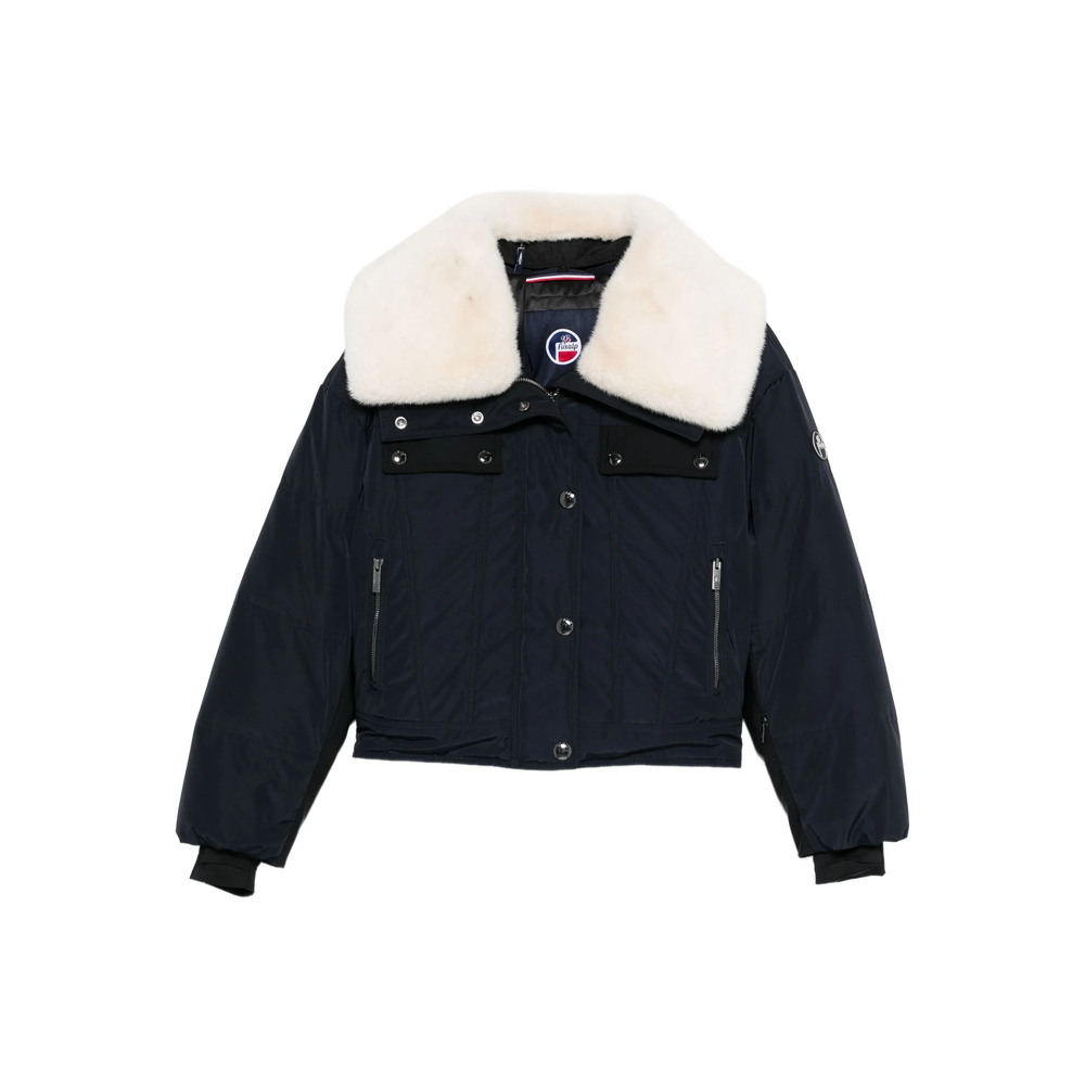 navy blue fur collar snap button fastening zip pockets quilted design elasticated cuffs