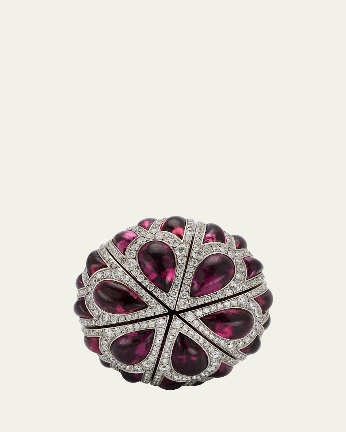 G ring Approx. ring size: 53 18karat white gold Cushioncut purple sapphire center; 3.76 total carat weight Multicut rhodolite; 13.35 total carat weight Roundcut white diamonds; 3.68 total carat weight Made in Switzerland
