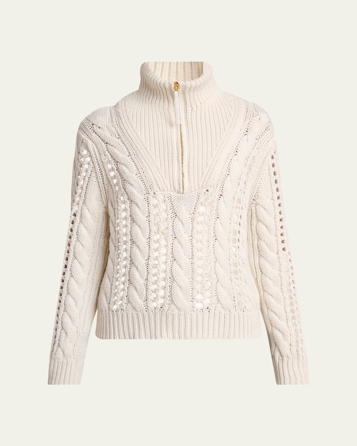 The Gabriela Hearst "Idris" sweater combines classic fisherman cableknit styling with a funnel neck that channels warmth and functionality. Mock neckline Long sleeves Ribbed cuffs and hem Hip length Relaxed fit Zip front closure Cashmere Made in Italy