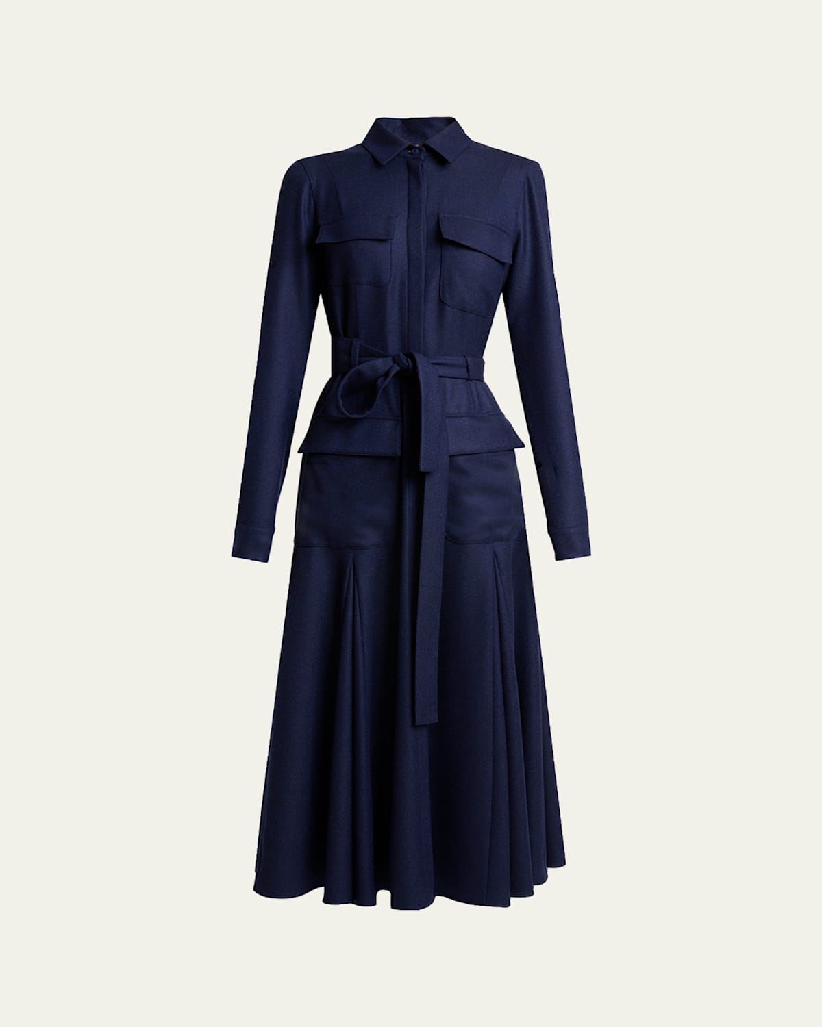 Detailed with pleating through the skirt for added volume, the "Meyer" shirtdress by Gabriela Hearst is crafted from a luxe blend of virgin wool and cashmere Shirt collar; concealed front placket Long sleeves; button cuffs Front flap pockets Selftie belt through belt loops Hem falls below the knee Aline silhouette Virgin wool/cashmere Made in Italy