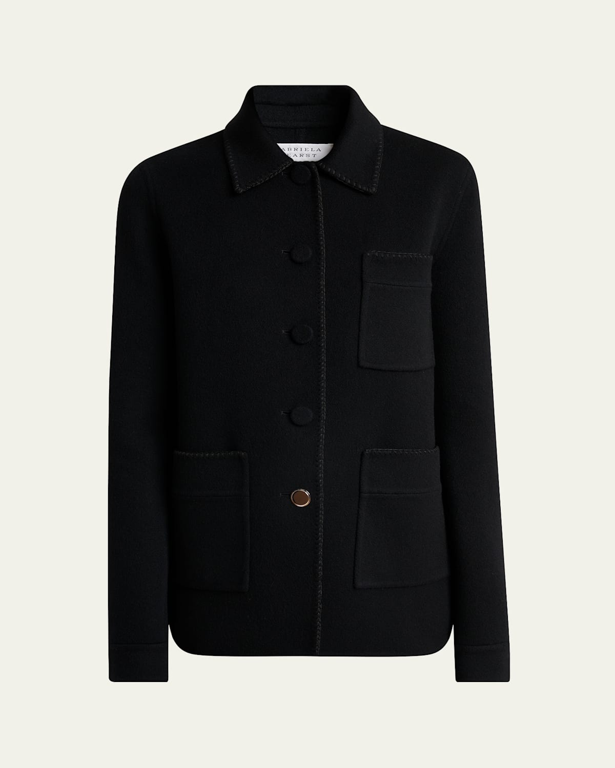 Signature artisanal blanket stitches on the collar, placket, and pocket edges define the "Ulu" chore jacket by Gabriela Hearst, while a rose gold metal button adds a touch of elegant contrast to this minimalist, utilitarian style. Point collar Long sleeves Chest patch pocket Two side patch pockets Slim fit Button front closure Cashmere Made in Italy
