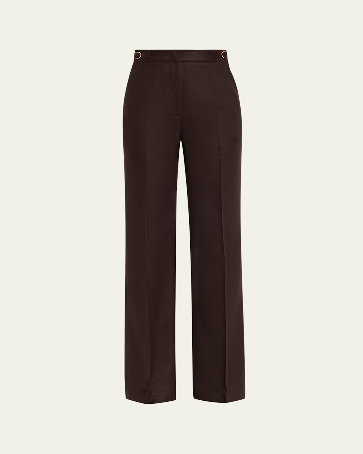 Gabriela Hearst "Vesta" pants in a silk crepe adorned with waist buckle details Mid ris sits high on hip Anged side slip pockets Back welt pockets Straight legs Full length Hook/zip fly Full length Silk Made in Italy