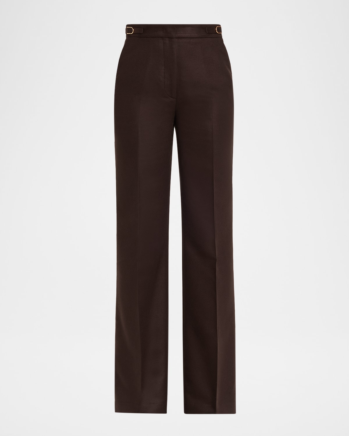 Gabriela Hearst "Vesta" pants in a silk crepe adorned with waist buckle details Mid ris sits high on hip Anged side slip pockets Back welt pockets Straight legs Full length Hook/zip fly Full length Silk Made in Italy