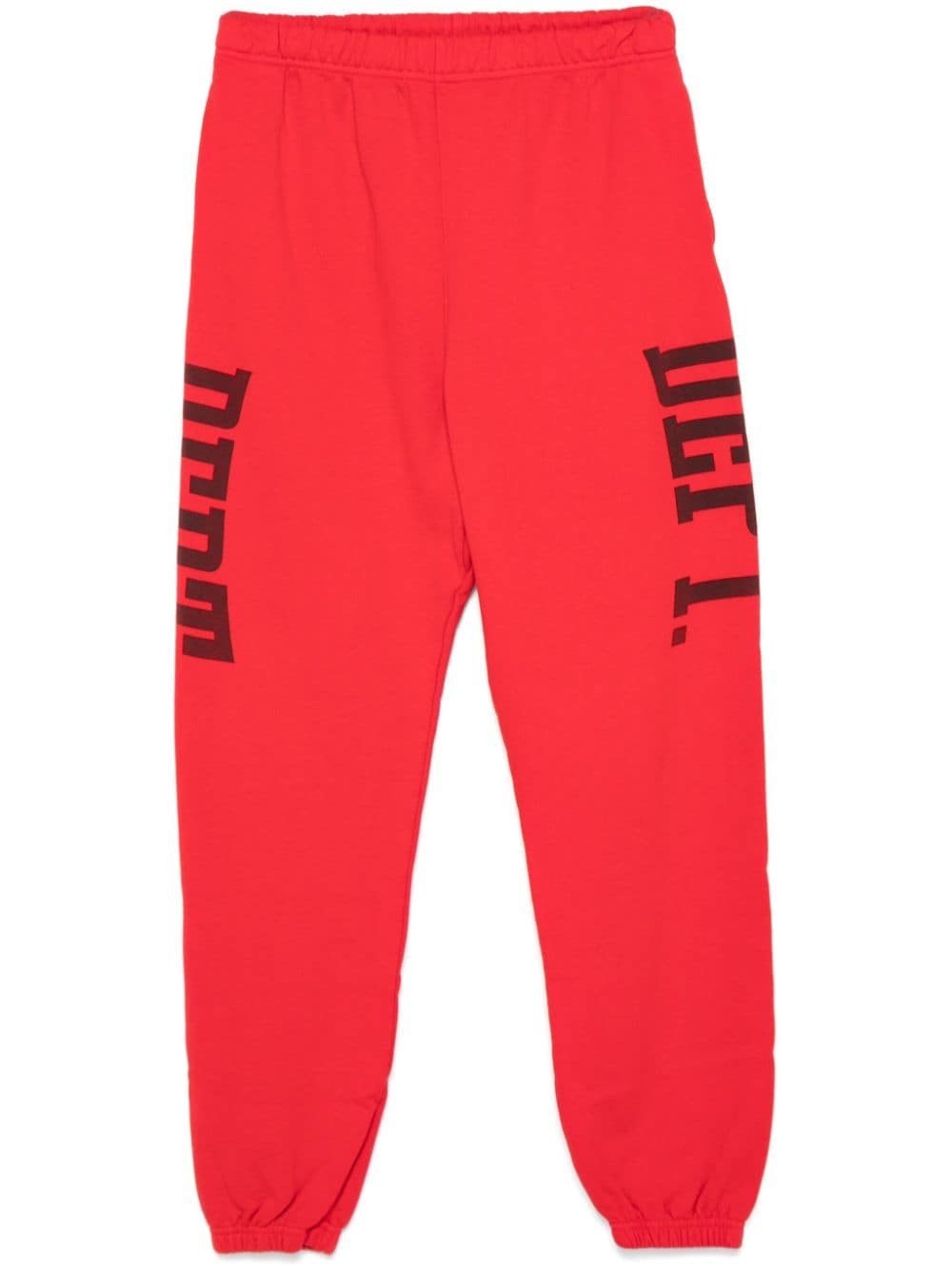 cardinal red cotton jersey texture elasticated waistband with internal drawstring two side inset pockets logo print to the side elasticated ankles tapered leg When buying this unisex item, keep in mind that it is graded in standard men's sizing.