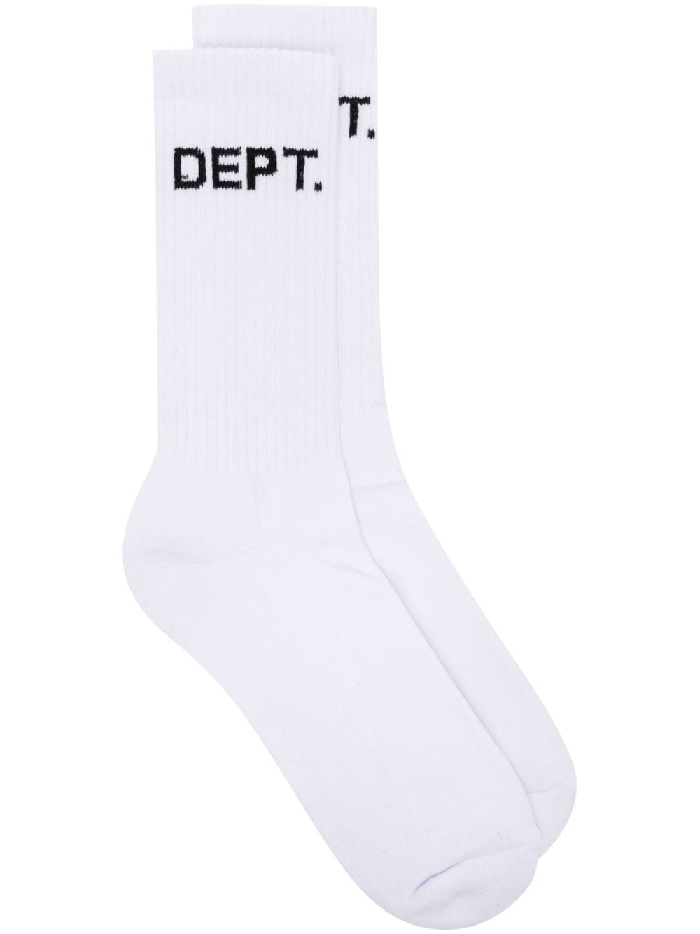 white cotton blend stretch-design ribbed-knit edge pull-on style jacquard logo motif mid-calf length Be sure before opening, as socks and hosiery can only be returned in their original, unopened packaging.