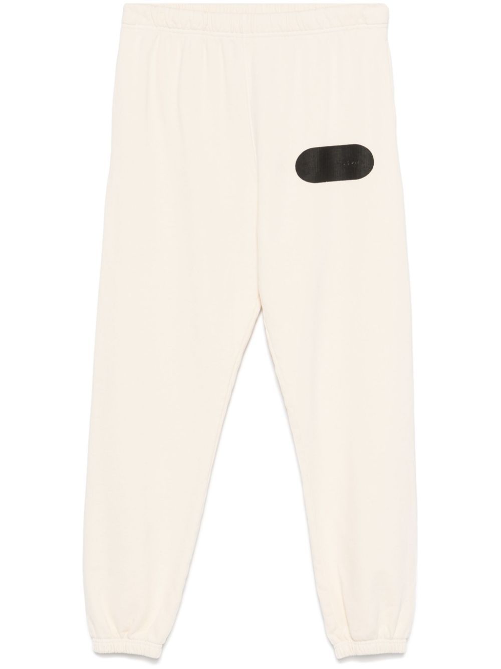 cream white cotton jersey texture elasticated waistband with internal drawstring two side inset pockets graphic print to the leg elasticated ankles fleece lining full-length When buying this unisex item, keep in mind that it is graded in standard men's sizing.