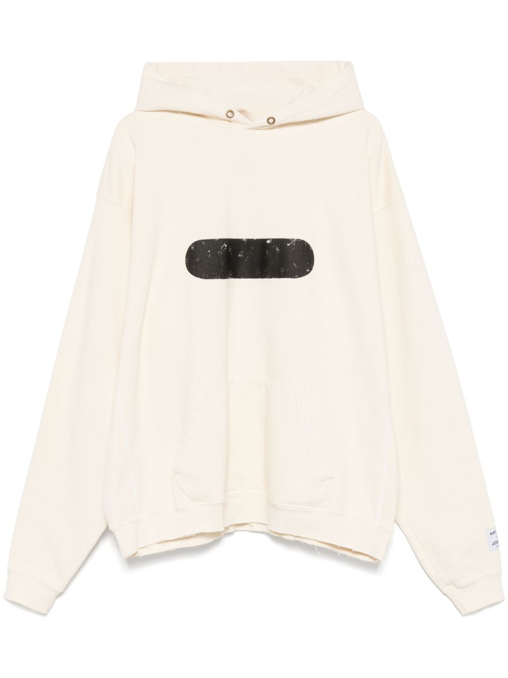 cream white cotton jersey texture slouchy hood drop shoulder long sleeves logo patch at the sleeve graphic print to the front distressed effect to the print front pouch pocket ribbed cuffs and hem French terry lining When buying this unisex item, keep in mind that it is graded in standard men's sizing.