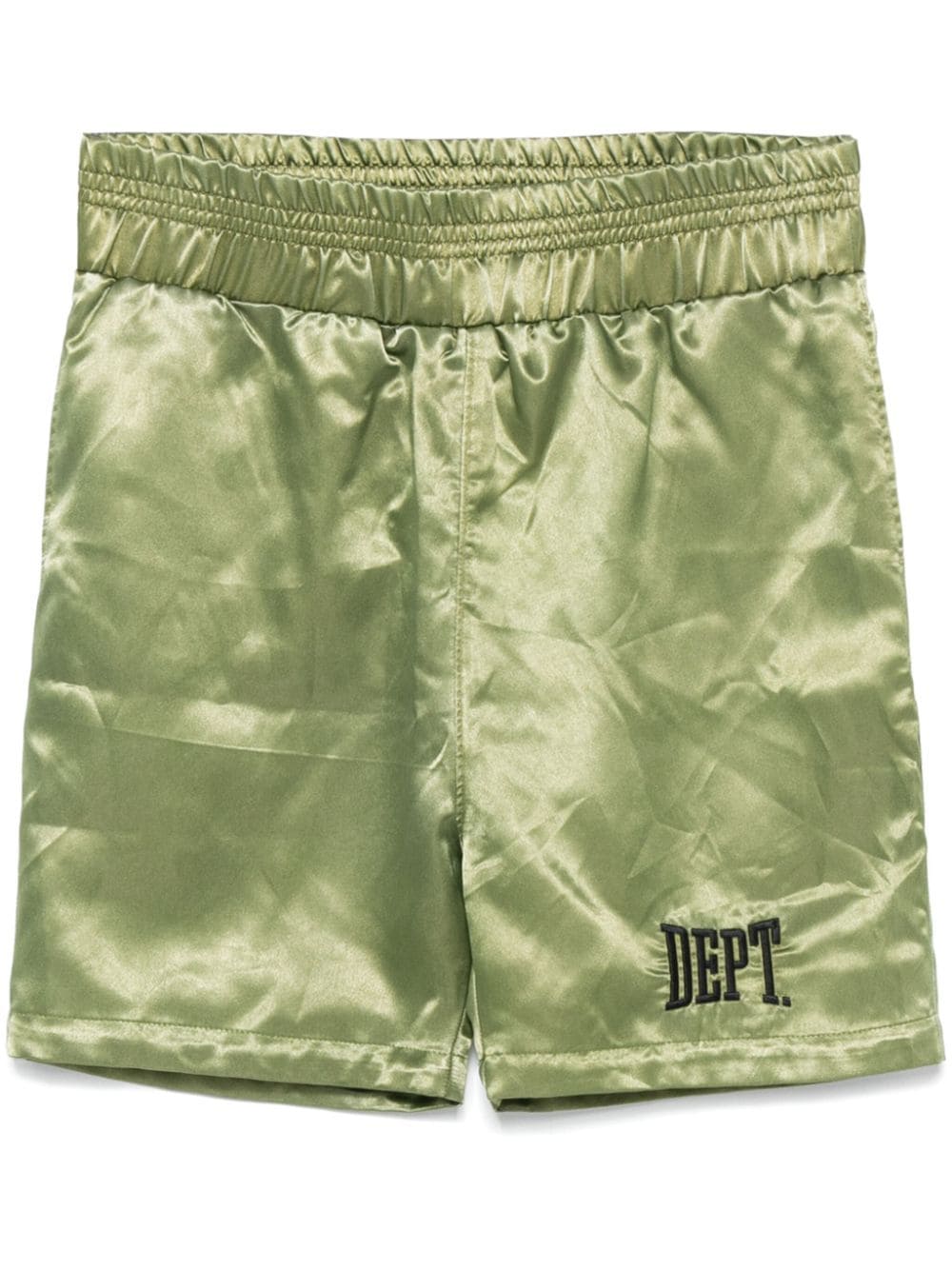 fern green satin finish elasticated waistband two side inset pockets embroidered logo to the front rear patch pocket mini logo tag mesh lining straight leg knee-length When buying this unisex item, keep in mind that it is graded in standard men's sizing.