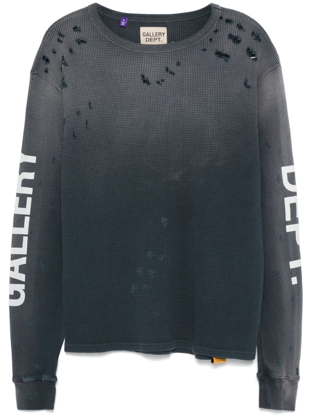 black/grey cotton waffle effect ombré effect crew neck distressed finish drop shoulder long sleeves ribbed cuffs logo print to the rear straight hem When buying this unisex item, keep in mind that it is graded in standard men's sizing.