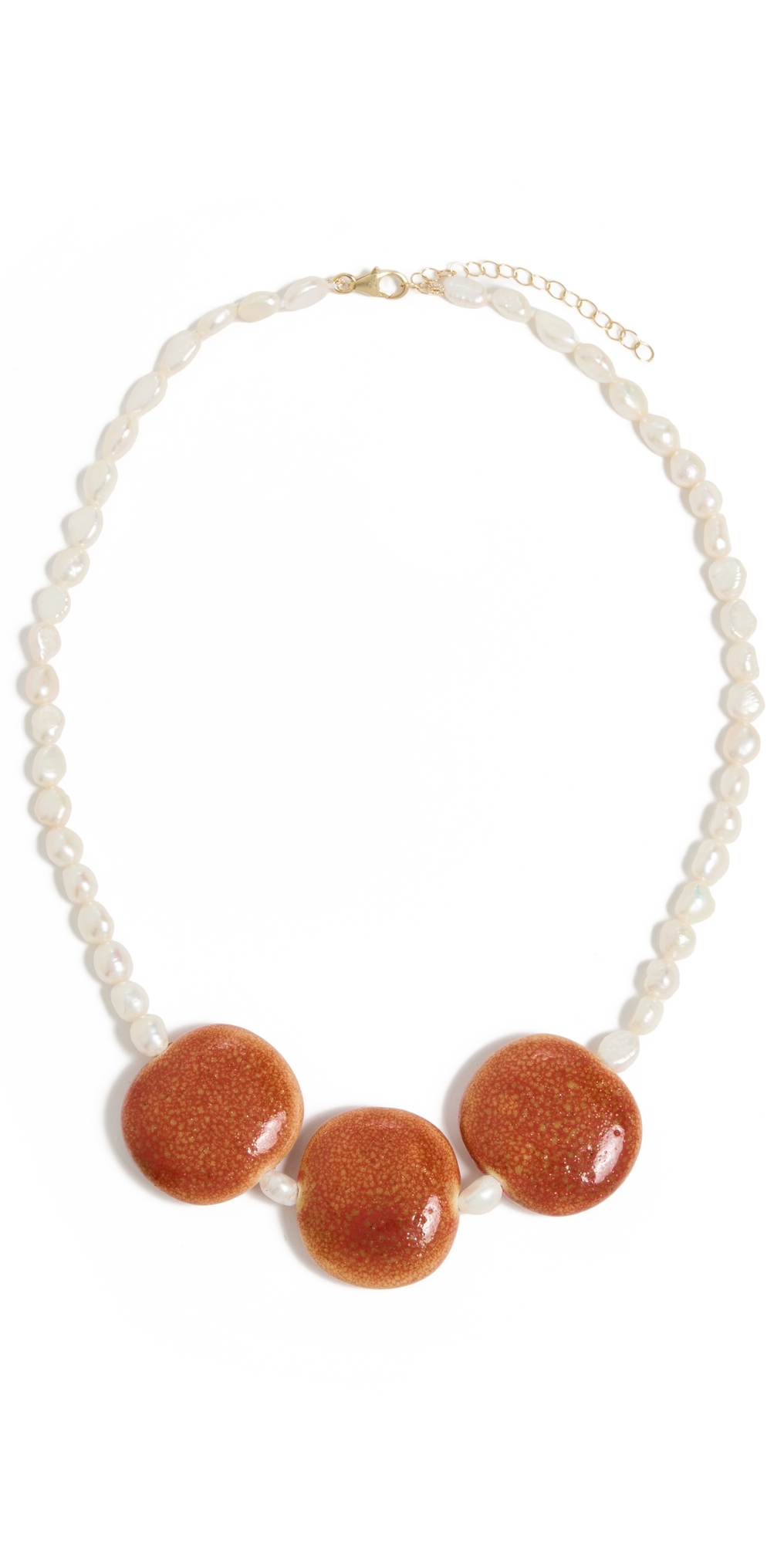 Ceramic beads. Freshwater cultured pearls. Lobster claw clasp. Made in the USA. Measurements: Length: 16.25-18in / 41.0-46.0cm