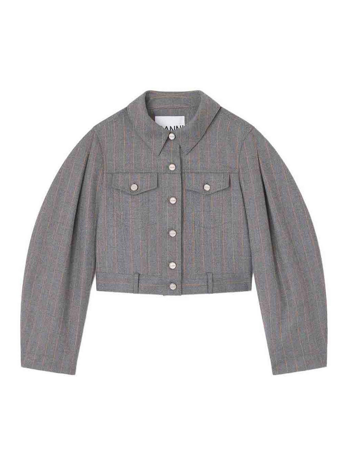 Manches bouffantes grises à fines rayures, poches courtes à rabat boutonnées