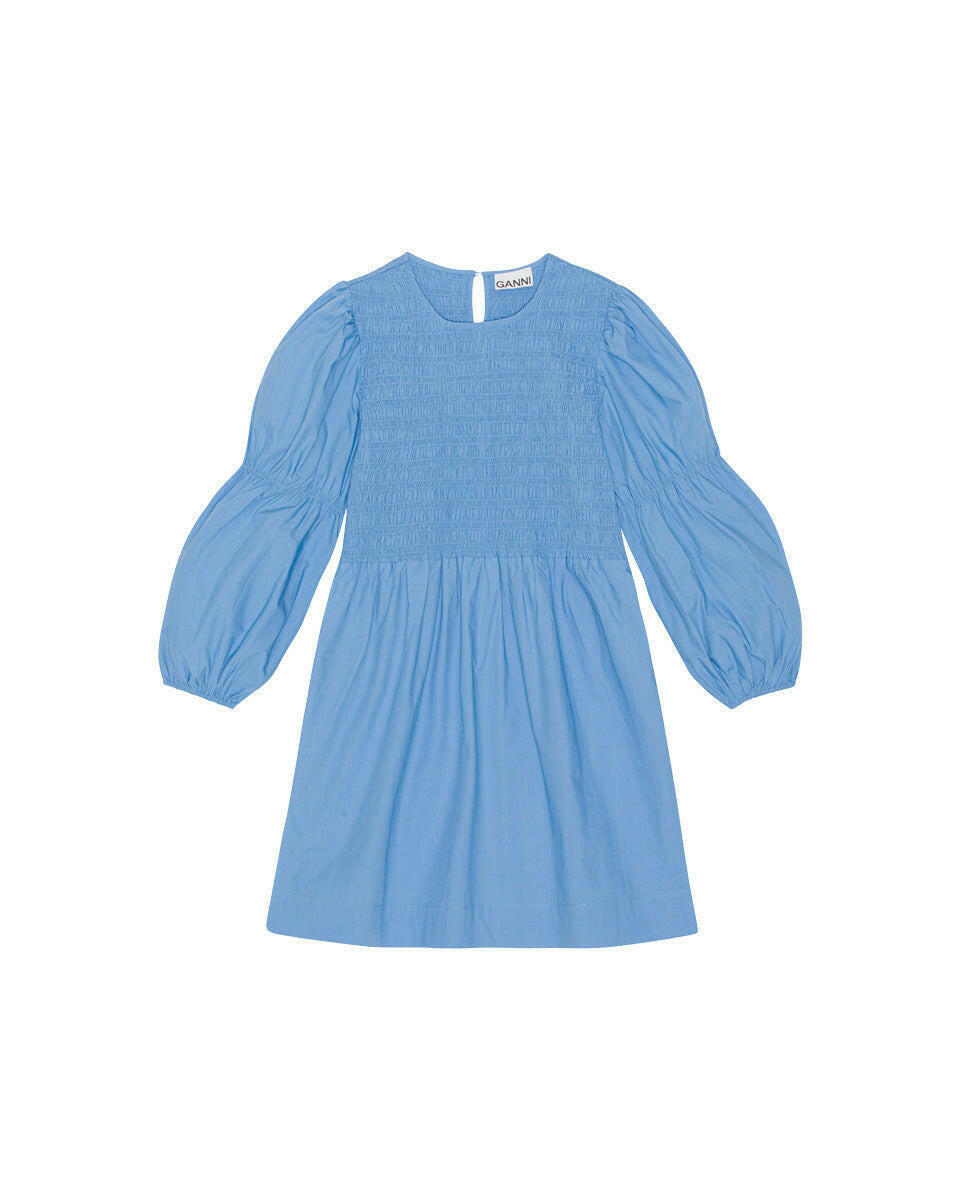 FINAL SALE The Cotton Poplin Smock Mini Dress in Silver Lake Blue by Ganni is a long sleeve, mini dress featuring a smocked bodice and long sleeves with elastic detailing. Button closure at the back. Regular fit F8521