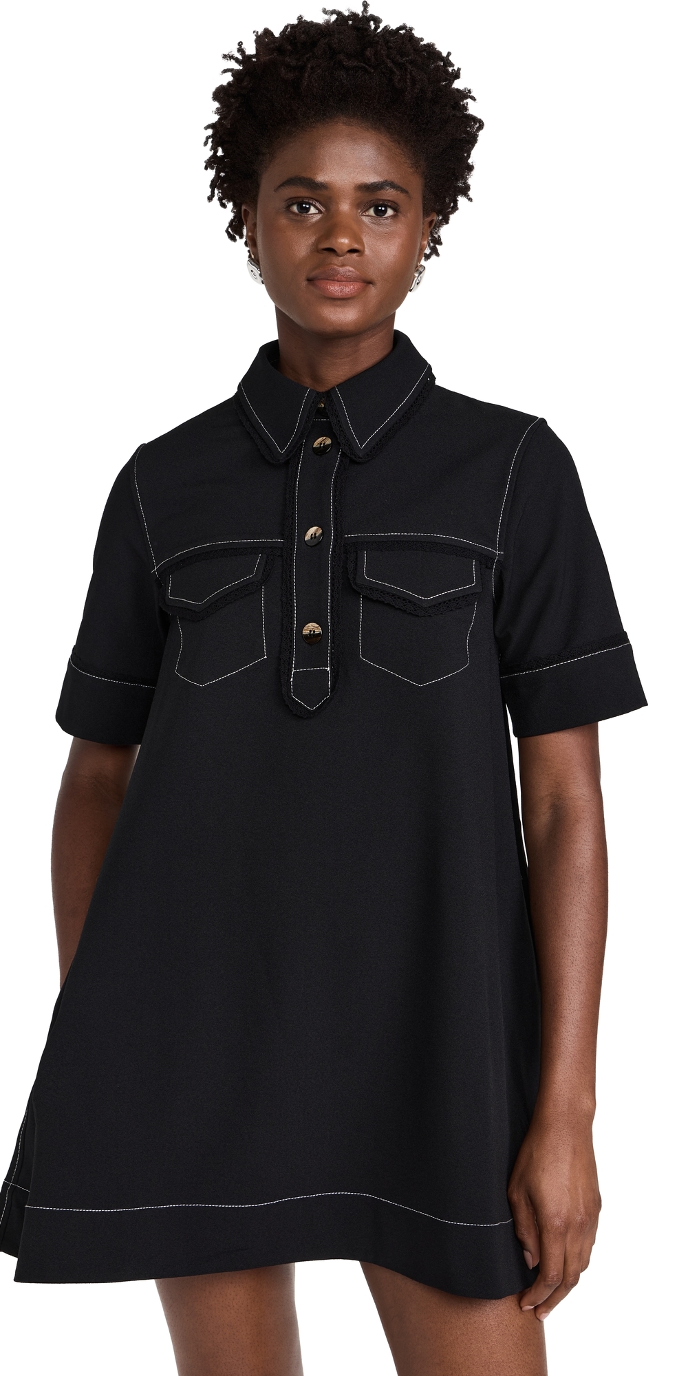 Fabric: Mid-weight, stretch crepe. Contrast stitching. Crochet trim. Mini length. Collared neck. Short sleeves. Partial button placket. Flap breast pockets. On-seam side pockets. Shell: 96% polyester/4% elastane. Unlined. Wash cold. Imported, Turkey. Measurements: Measurements from size 34 Length: 32in / 81.0cm, from shoulder