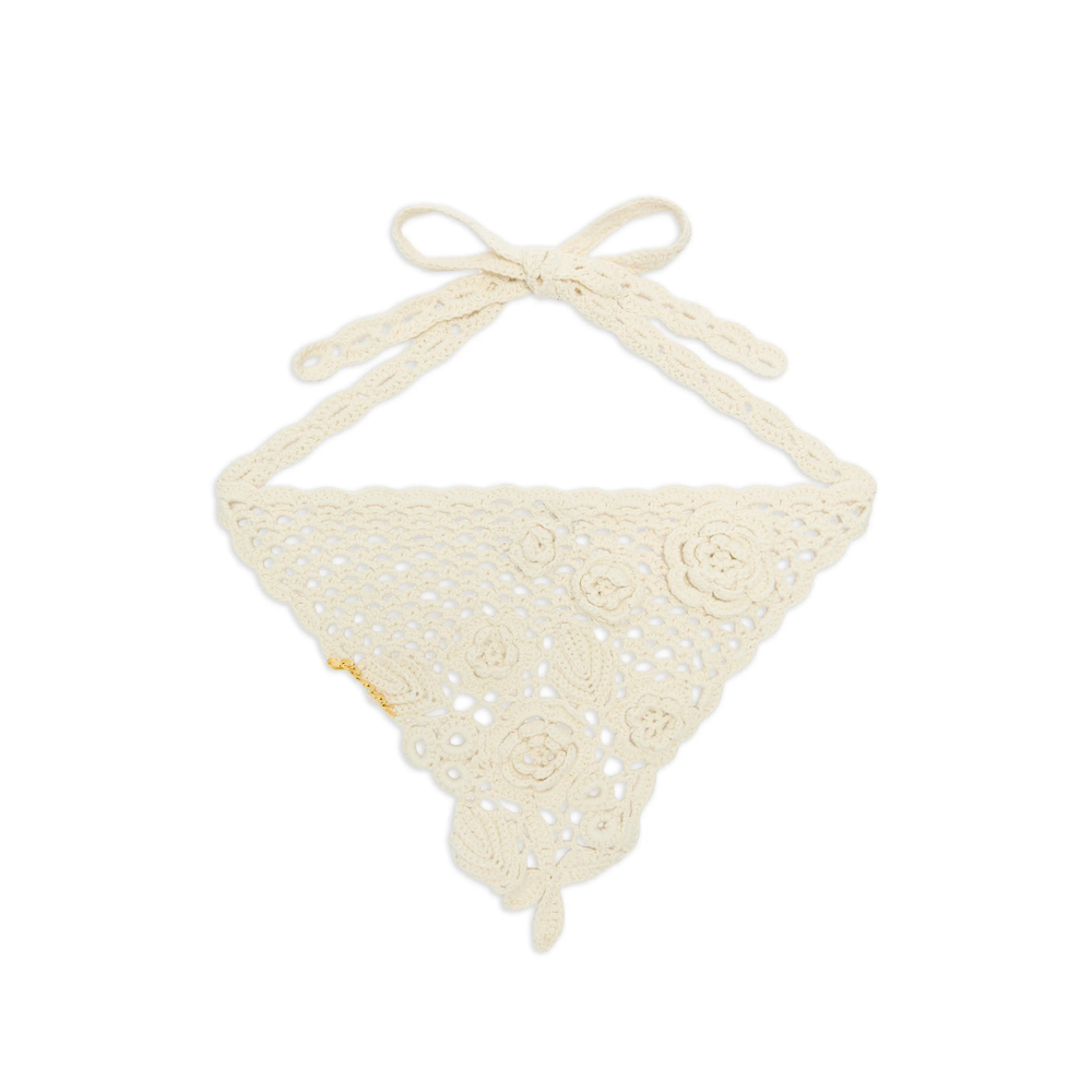 cream crochet knit floral appliqués scalloped trim tie fastening triangular shape