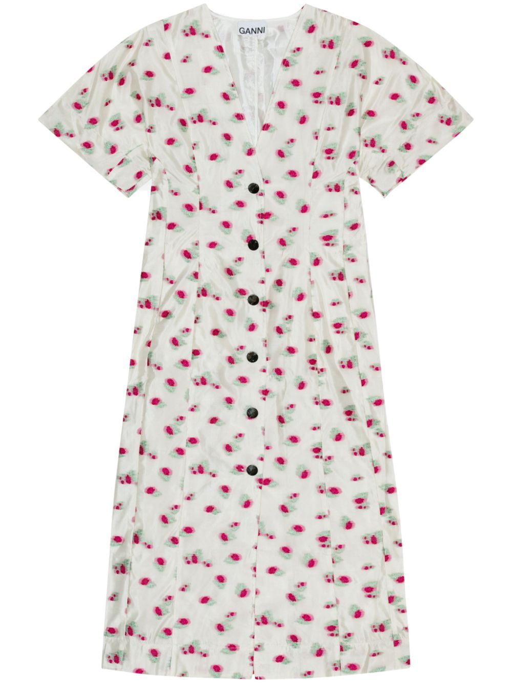 white/multicolour recycled polyester blend organza all-over floral print V-neck short sleeves front button fastening mid-length straight hem This item is made from at least 50% recycled or upcycled materials. For recycled synthetic clothing products, we highly recommend using a microfibre-catching washing bag to ensure that no microplastics that can pollute water are released in the process. Learn more about what makes a product Conscious on our Conscious Criteria page