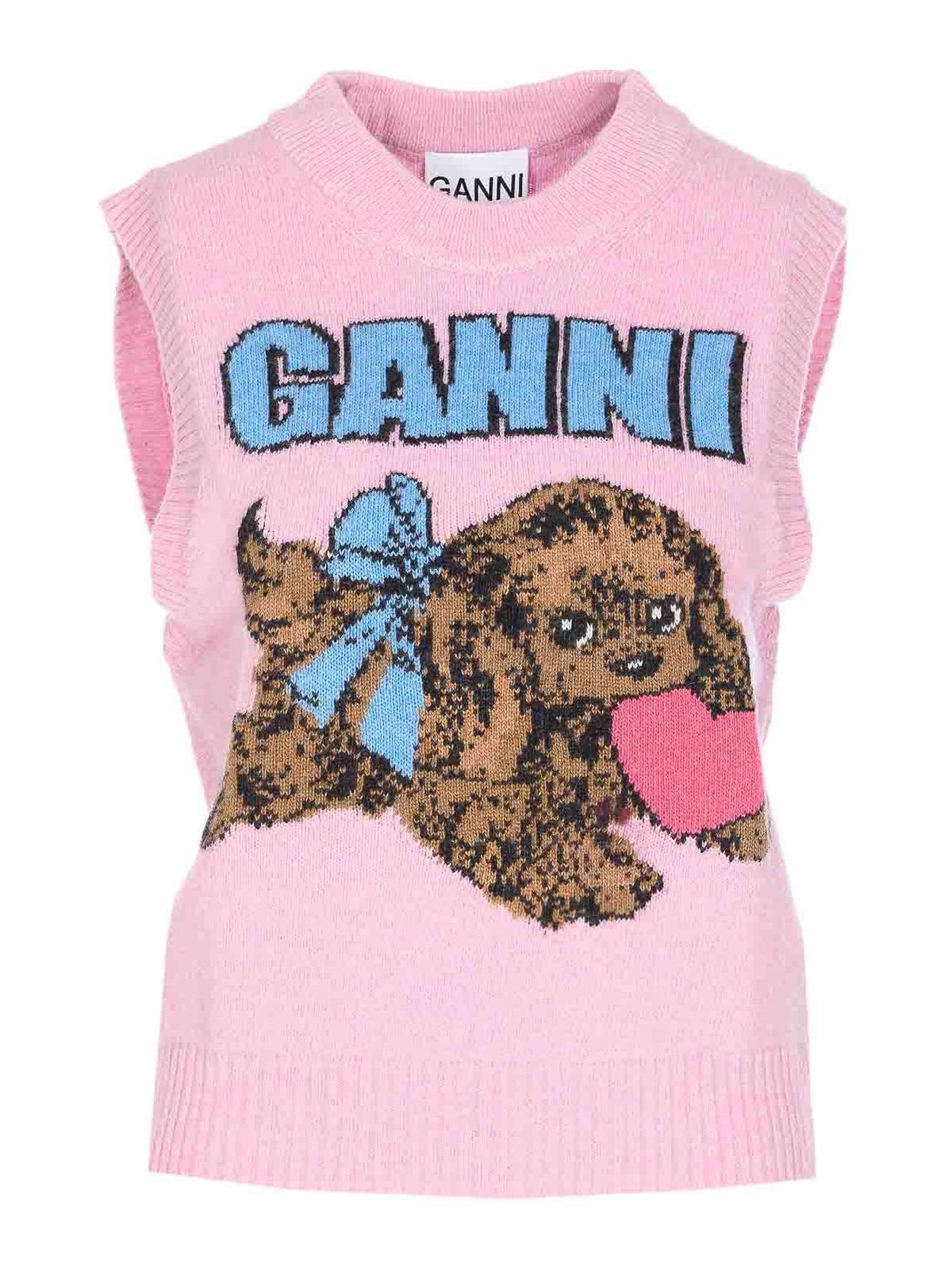 Gilet graphique rose Ganni, col rond, sans manches, logo brodé et chiot. Nom de la couleur du créateur: rose.