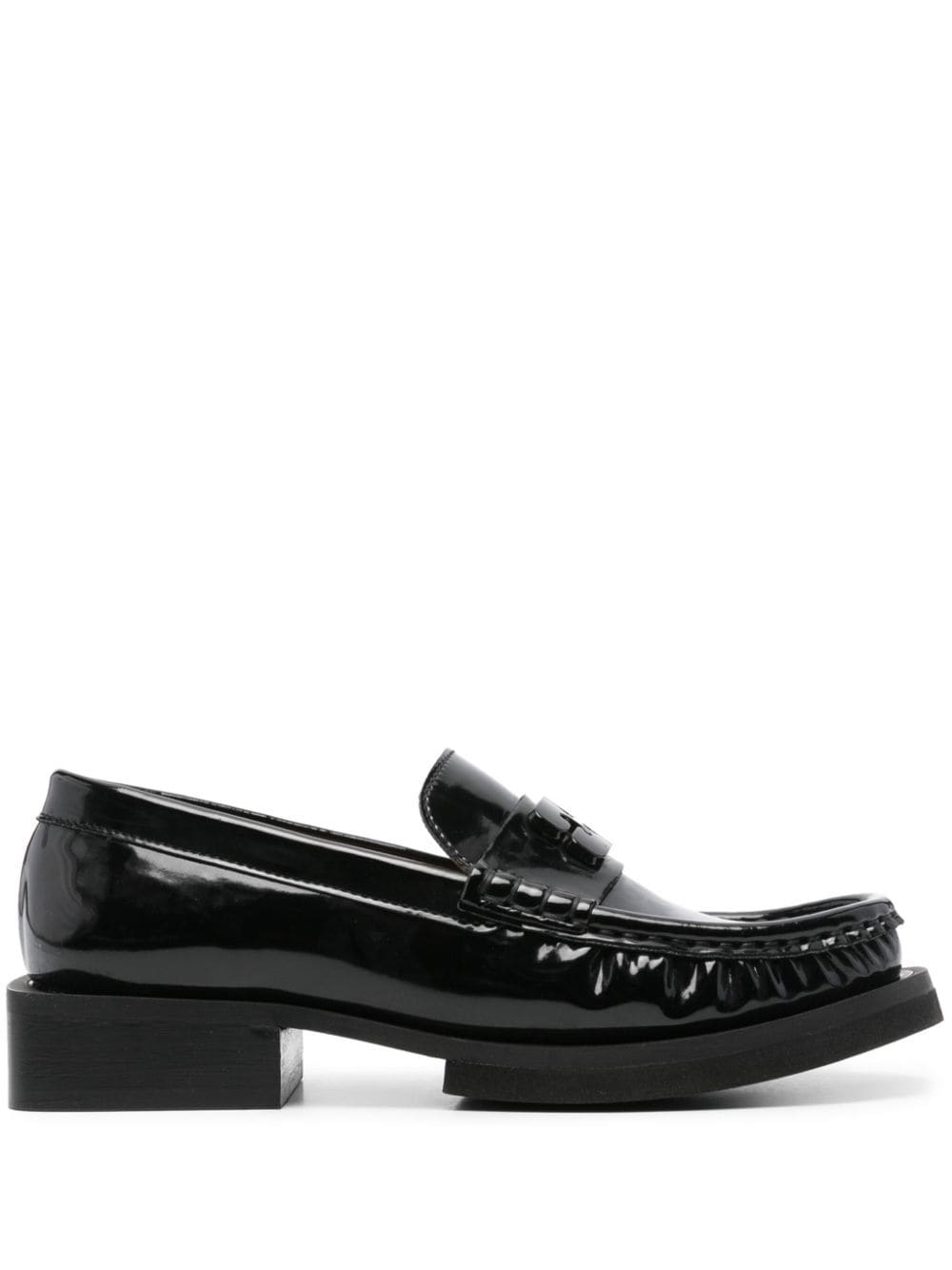 black faux leather patent finish round toe moc stitching ruched detailing tonal logo plaque to the front branded insole low block heel rubber sole slip-on style This piece comes complete with a protective dust bag.